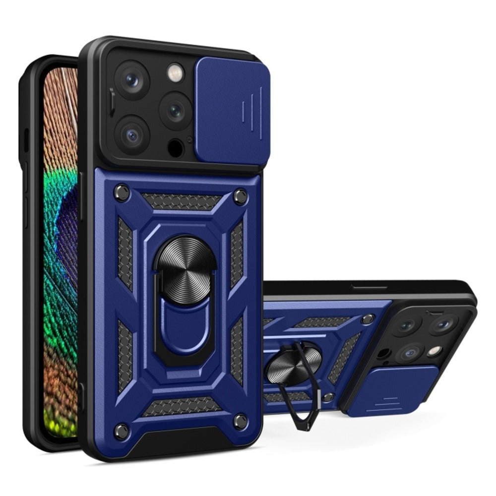Funda Case para iPhone 14 Pro Anillo Holder Metálico con Protector de Cámara Deslizante Color Azul.